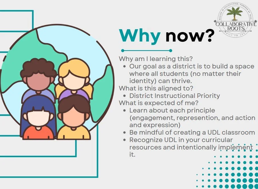 District-wide Universal Design for Learning (UDL) training deck, designed for teacher leaders and site administrators. This resource enhances professional learning communities and development sessions, emphasizing inclusive teaching strategies that meet diverse learner needs. With engaging activities and practical tips, it guides leaders in creating an environment where all students can thrive. Harness UDL to elevate teaching practices and collaboration among staff, ensuring every child receives the support they need to succeed. (example of slides below, contact us for the full deck)